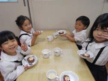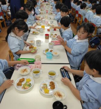 お給食もばら組、れんげ組、たんぽぽ組、いちご組さんみんなで食べて